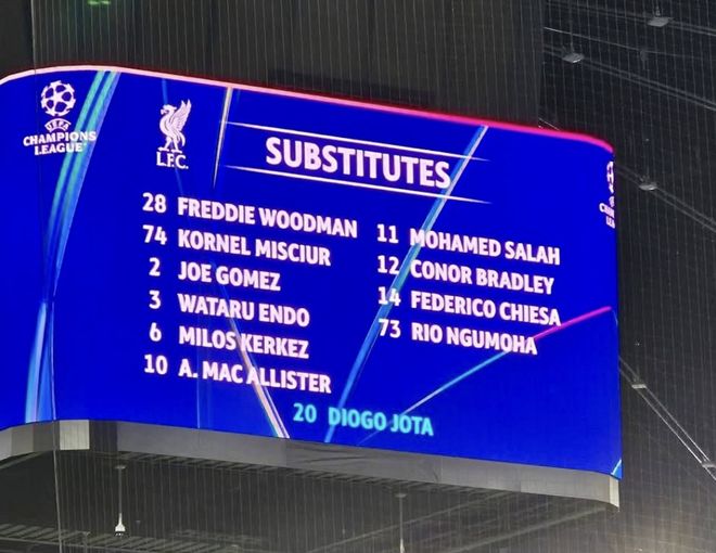 雷速体育10月23日讯 欧冠联赛阶段第三轮,利物浦客场挑战法兰克福。半场结束利物浦3-1领先法兰克福。比赛中出现暖心一幕,法兰克福主场的大屏幕显示利物浦替补球员时,加入了今夏不幸离世的若塔的名字。